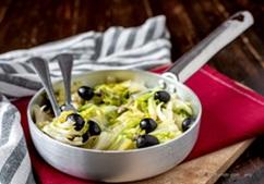 A questo punto unire la cicoria pan di zucchero tagliata a listarelle. Salare poi unire anche le olive e i capperi. Questi ultimi vanno bene sia sottaceto che sotto sale. In quest'ultimo caso, però, vanno sciacquati molto bene per far perdere loro il sale in eccesso. Chiudere la padella con un coperchio e lasciare stufare il radicchio a fiamma bassa per 10 minuti mescolando ogni tanto. A fine cottura togliere il coperchio, aumentare la fiamma e fare asciugare l'eventuale liquido che si sarà formato.